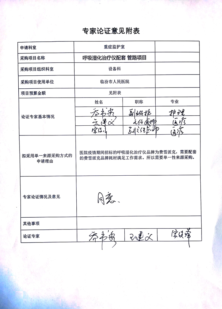 醫(yī)院疫情期間招標(biāo)的呼吸濕化治療儀品牌為費雪派克,需要配套的費雪派克品牌耗材用以滿足工作需要。(專家論證意見表附后)