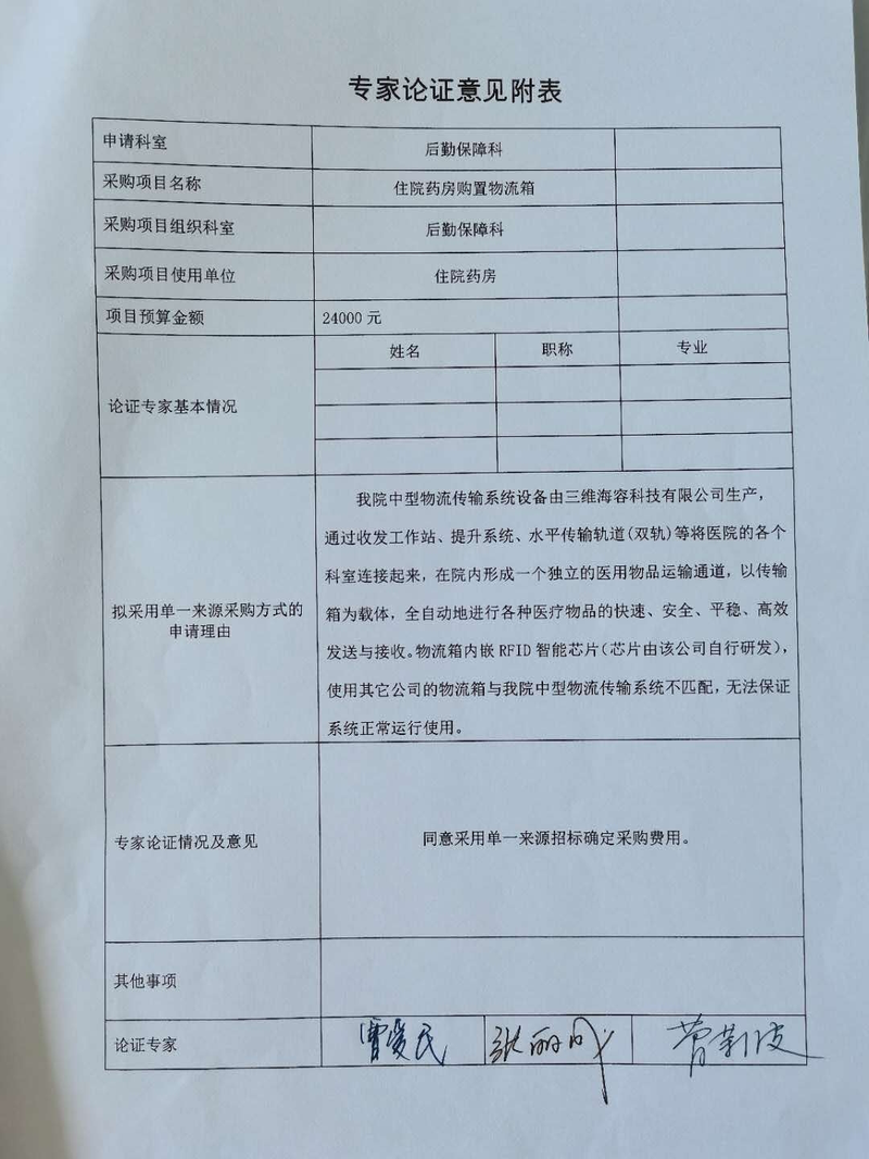 物流箱內(nèi)嵌RFID智能芯片(芯片由北京三維海容科技有限公司自行研發(fā)),使用其它公司的物流箱與我院中型物流傳輸系統(tǒng)不匹配,無(wú)法保證系統(tǒng)正常運(yùn)行使用。 (專家論證意見表附后)