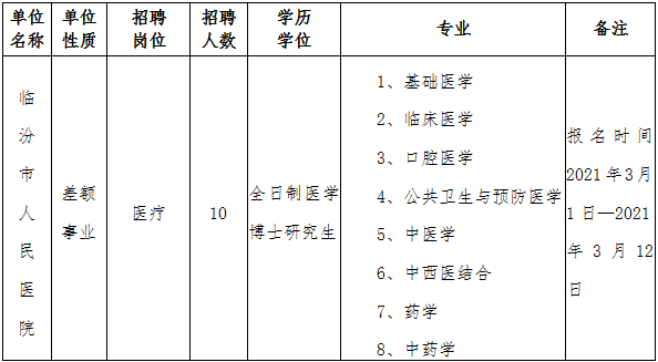 我院創(chuàng)建于1946年,前身是晉南專區(qū)人民醫(yī)院、臨汾地區(qū)人民醫(yī)院,2001年撤地改市后更名為臨汾市人民醫(yī)院。我院為全市一所集醫(yī)療、教學(xué)、科研、預(yù)防、康復(fù)為一體的綜合性三級(jí)甲等醫(yī)院。我院現(xiàn)有省級(jí)重點(diǎn)學(xué)科4個(gè)、市級(jí)重點(diǎn)學(xué)科4個(gè)、院級(jí)5個(gè)。為廣泛吸納和引進(jìn)創(chuàng)新型人才,優(yōu)化醫(yī)院隊(duì)伍結(jié)構(gòu),根據(jù)臨人社發(fā)〔2020〕年25號(hào)文件精神,我院2021年校園招聘計(jì)劃如下: