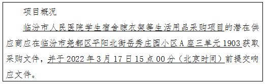 項目名稱:臨汾市人民醫(yī)院學(xué)生宿舍晾衣架等生活用品采購項目