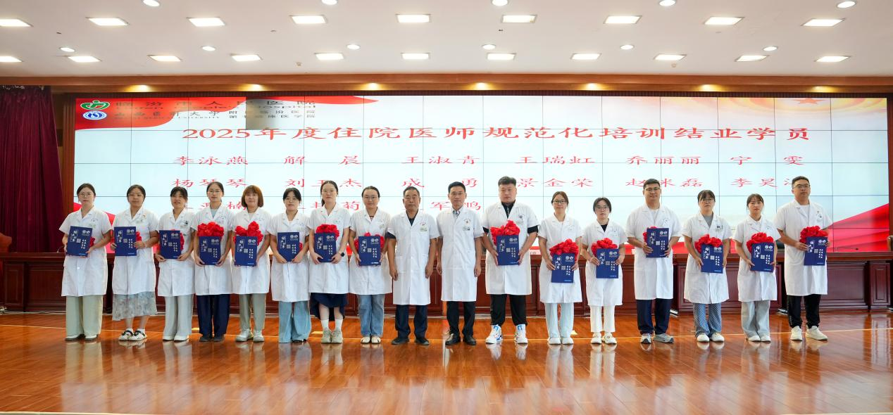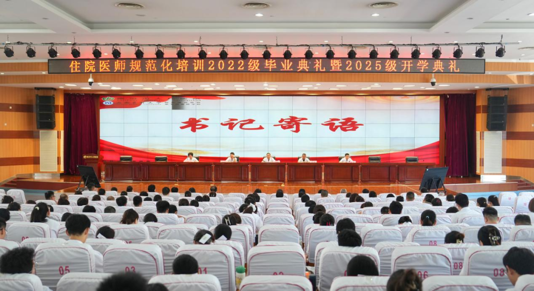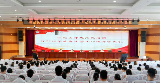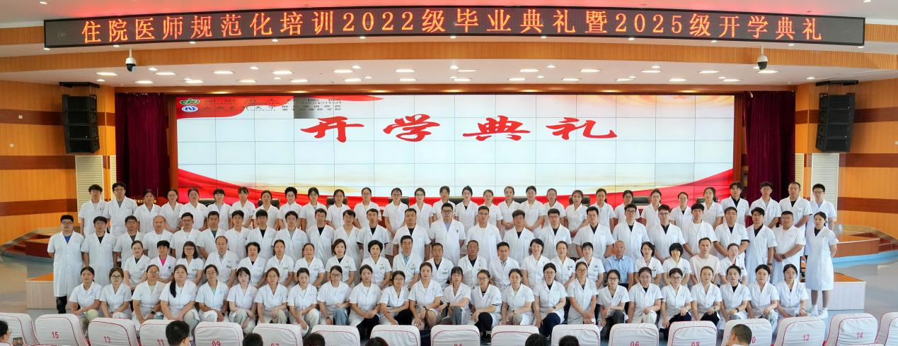 8月19日上午,我院住院醫(yī)師規(guī)范化培訓(xùn)2022級(jí)學(xué)員畢業(yè)典禮暨2025級(jí)學(xué)員開學(xué)典禮在行政樓大報(bào)告廳舉行。院黨委書記王好收,黨委委員、副院長(zhǎng)趙波,黨委委員、副院長(zhǎng)景文記,黨委委員、紀(jì)委書記韓飛,副院長(zhǎng)吳春玲出席活動(dòng),相關(guān)專業(yè)基地教學(xué)管理人員、帶教老師與全體學(xué)員參加。