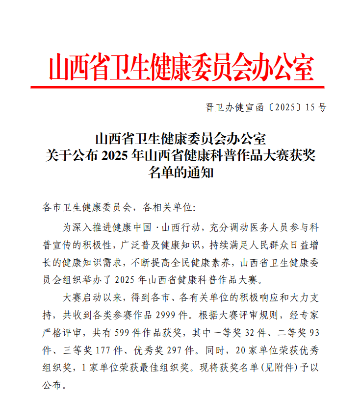 為深入推進(jìn)健康中國·山西行動(dòng),充分調(diào)動(dòng)醫(yī)務(wù)人員參與科普宣傳的積極性,廣泛普及健康知識(shí),持續(xù)滿足人民群眾日益增長的健康知識(shí)需求,不斷提高全民健康素養(yǎng),山西省衛(wèi)生健康委員會(huì)組織舉辦了2025年山西省健康科普作品大賽。8月20日,大賽獲獎(jiǎng)名單揭曉,我院榮獲優(yōu)秀組織獎(jiǎng),表演類優(yōu)秀獎(jiǎng)1項(xiàng),視頻類二等獎(jiǎng)1項(xiàng)、三等獎(jiǎng)6項(xiàng),圖文類一等獎(jiǎng)1項(xiàng)、三等獎(jiǎng)1項(xiàng)、優(yōu)秀獎(jiǎng)4項(xiàng)。
