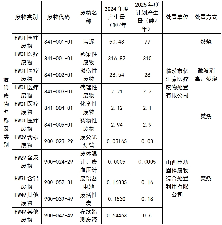 根據《中華人民共和國固體廢物污染防治法》等文件規(guī)定,現將我院2025年計劃危險廢物收集、產生、貯存、轉移處置情況公示如下: