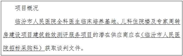 采購需求:臨汾市人民醫(yī)院全科醫(yī)生臨床培養(yǎng)基地、兒科住院樓及專家周轉(zhuǎn)房建設(shè)項目建筑能效測評服務(wù),需要進行能效測評相關(guān)檢測、編制建筑能效測評報告,協(xié)助采購人完成項目節(jié)能驗收工作。詳見談判文件。