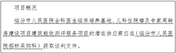 采購(gòu)需求:臨汾市人民醫(yī)院全科醫(yī)生臨床培養(yǎng)基地、兒科住院樓及專家周轉(zhuǎn)房建設(shè)項(xiàng)目建筑能效測(cè)評(píng)服務(wù),需要進(jìn)行能效測(cè)評(píng)相關(guān)檢測(cè)、編制建筑能效測(cè)評(píng)報(bào)告,協(xié)助采購(gòu)人完成項(xiàng)目節(jié)能驗(yàn)收工作。詳見(jiàn)談判文件。