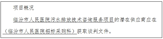 采購需求:為臨汾市人民醫(yī)院重新申領(lǐng)排污許可證提供專業(yè)技術(shù)服務(wù),通過技術(shù)審查、專家論證,完成排污許可證申領(lǐng)工作,詳見談判文件。