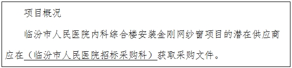 項目名稱:臨汾市人民醫(yī)院內(nèi)科綜合樓安裝金剛網(wǎng)紗窗項目