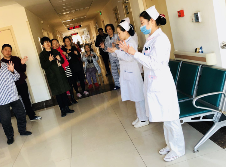 這是在我院風(fēng)濕免疫科9床住院的患者張玉英阿姨,因?yàn)槿矶嚓P(guān)節(jié)腫痛3個(gè)月入院,入院時(shí)由家屬陪護(hù)平車推入病區(qū),因?yàn)殛P(guān)節(jié)疼痛嚴(yán)重,老人說(shuō),疼的我連眼睛都不想睜,進(jìn)食差,睡眠也很差,自理能力重度依賴,通過(guò)責(zé)任護(hù)士的宣教,講解疾病知識(shí)和病情發(fā)展,護(hù)理員為患者做生活護(hù)理,打水,剪指甲,洗臉,喂飯,一天又一天的治療后,老人開(kāi)始慢慢的能自己坐起來(lái),開(kāi)始主動(dòng)跟護(hù)士詢問(wèn)自己的病情、用藥、活動(dòng),慢慢由責(zé)任護(hù)士攙扶著在病房?jī)?nèi)活動(dòng),后來(lái)可以自己在病區(qū)走動(dòng),每天下午跟護(hù)士以及病區(qū)其他患者和家屬一起做關(guān)節(jié)操。