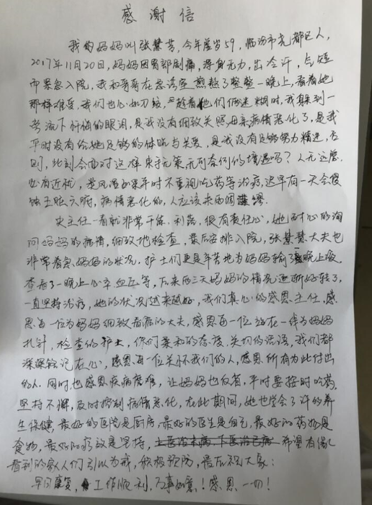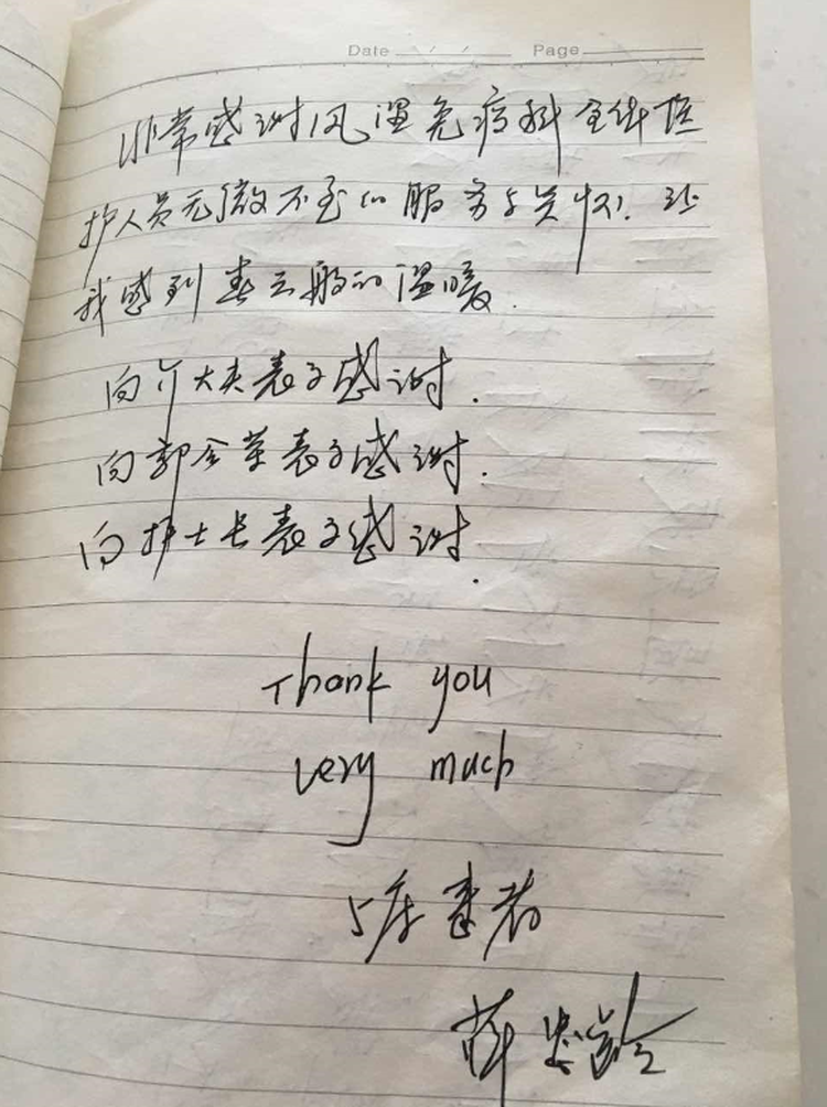 在這樣一個(gè)人們熱衷于網(wǎng)絡(luò)點(diǎn)贊的時(shí)代,這樣的點(diǎn)贊更讓人感覺(jué)到暖心。除了張阿姨,風(fēng)濕科還收到了很多來(lái)自患者的感謝信,很感謝每一位患者的一聲謝謝、一句鼓勵(lì),這是對(duì)于我們工作的最大肯定,我們會(huì)不忘初心,繼續(xù)前行!(風(fēng)濕免疫科)