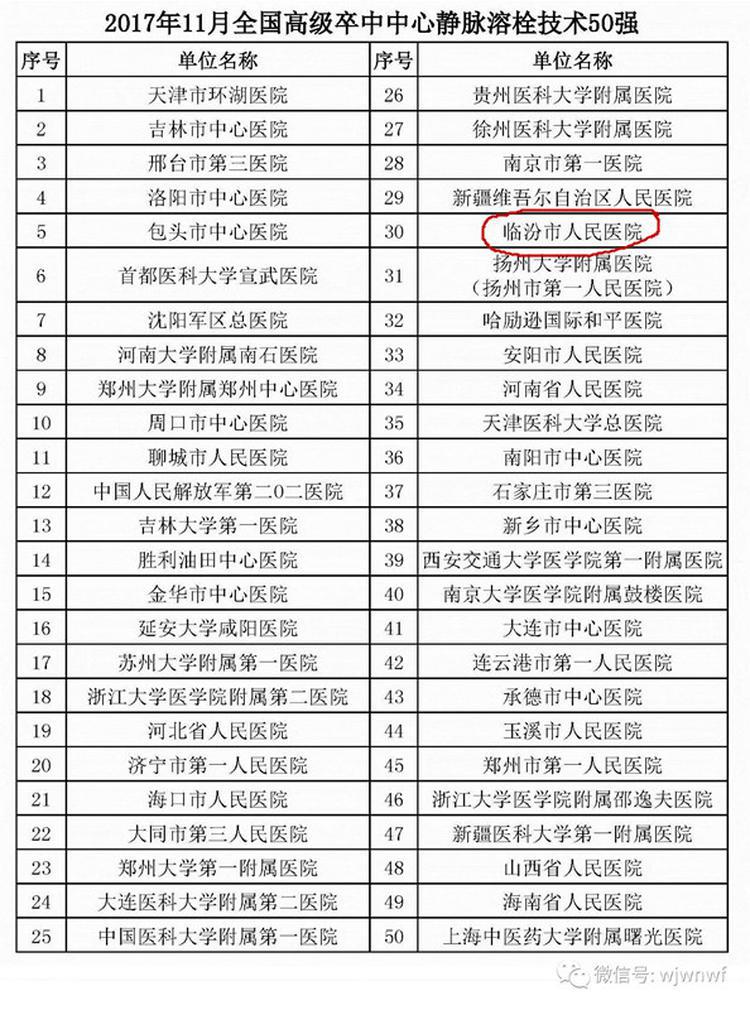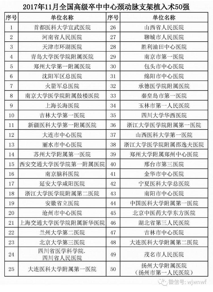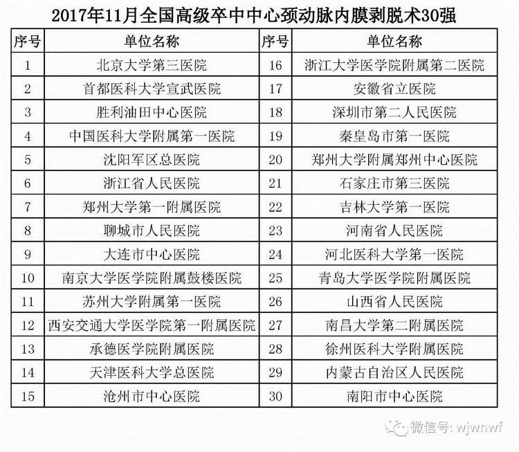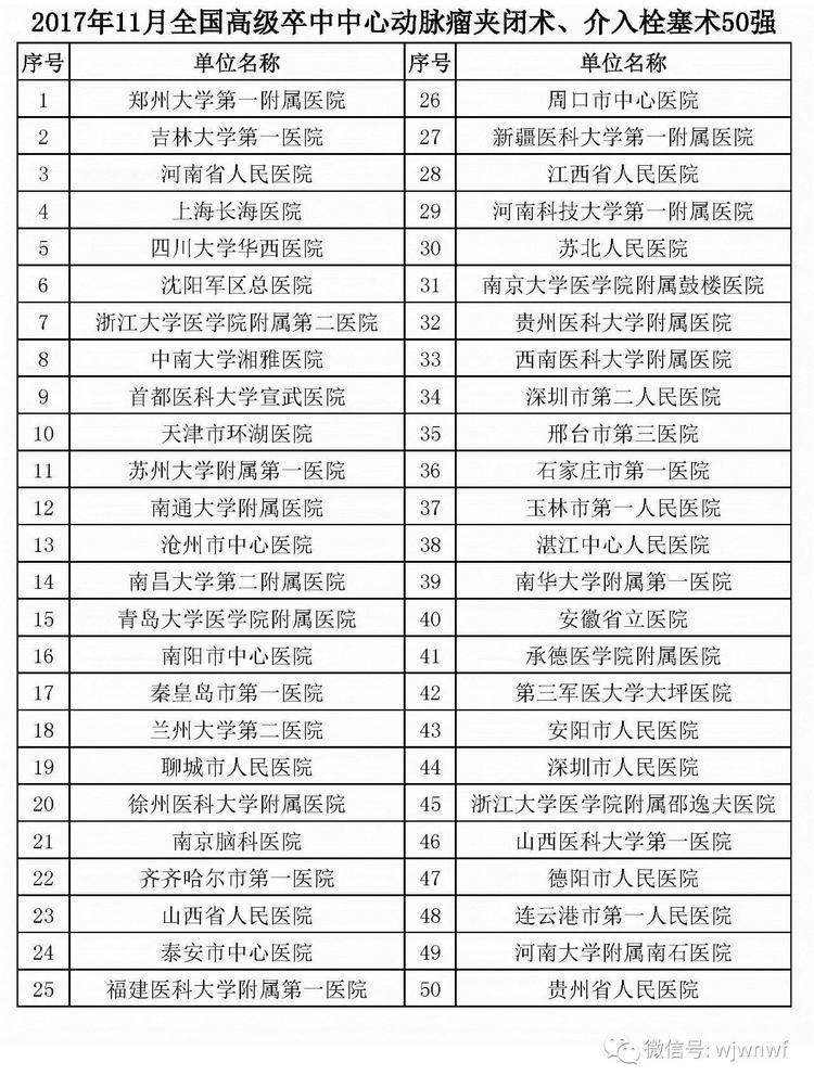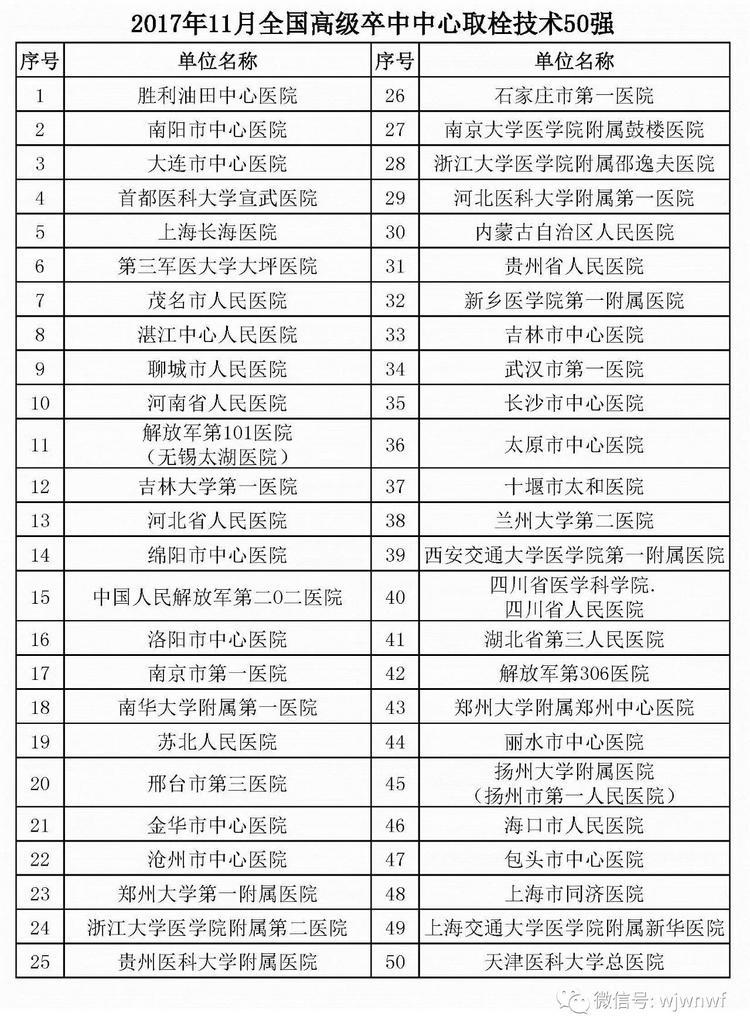 腦防委辦公室依據(jù)各地高級(jí)卒中中心單位11月份上報(bào)的靜脈溶栓、取栓、頸動(dòng)脈內(nèi)膜剝脫術(shù)例數(shù)、頸動(dòng)脈支架植入術(shù)例數(shù)、動(dòng)脈瘤夾閉術(shù)、介入栓塞術(shù),以及患者入院到治療時(shí)間、科研與培訓(xùn)能力、地區(qū)差異等,現(xiàn)公布11月份綜合100強(qiáng)和6個(gè)技術(shù)單項(xiàng)30或50強(qiáng)名單。我院被評(píng)選為11月全國(guó)高級(jí)卒中中心綜合100強(qiáng),全國(guó)高級(jí)卒中中心靜脈溶栓50強(qiáng)。(轉(zhuǎn)自中國(guó)心腦健康)