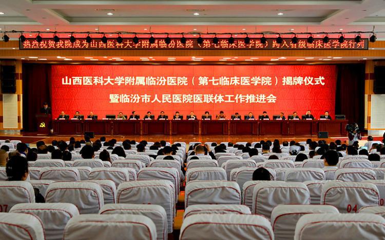 4月19日,山西醫(yī)科大學附屬臨汾醫(yī)院(第七臨床醫(yī)學院)揭牌儀式暨醫(yī)聯(lián)體工作推進會在我院學術(shù)報告廳舉行。山西醫(yī)科大學黨委書記張俊龍、副校長張輝,山西省人民醫(yī)院院長李榮山,西安醫(yī)學院第一附屬醫(yī)院院長李亞軍,省衛(wèi)計委體改處處長原效國,山西醫(yī)科大學醫(yī)院管理處處長覃凱,市人大副主任王金珍,市政府副市長陳忠輝,市政協(xié)副主席楊忠華,市編辦主任毛克明,市政府副秘書長郭志宏,市衛(wèi)計委主任王山,市衛(wèi)計委副主任吳國平,及我院領(lǐng)導蘇學峰、黃新升、許紅星、劉松山、李斌、王鐵忠出席揭牌儀式。各縣市衛(wèi)計局局長,二級以上醫(yī)療單位的院長,醫(yī)聯(lián)體成員單位領(lǐng)導及我院全體中層干部等有關(guān)人員共八百余人參加了儀式,儀式由我院黨委書記黃新升主持。