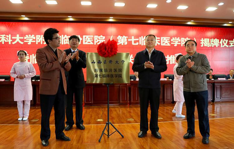 山西醫(yī)科大學張俊龍書記、市政府陳忠輝副市長、市衛(wèi)計委王山主任、我院蘇學峰院長共同揭牌。